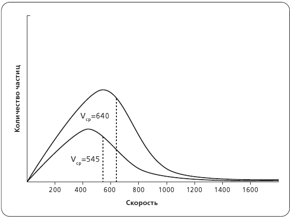 При той или иной температуре не все частицы вещества движутся с абсолютно одной и той же скоростью; некоторые перемещаются быстрее, чем все в среднем, а некоторые – медленнее. Распределение скоростей (или, более точно, кинетических энергий = ½ mv2) отражено в виде кривых, представленных на рис. 3.1. Поскольку ни одна частица не может двигаться медленнее нуля, распределение немного асимметрично, а несколько частиц движутся намного быстрее среднего значения (например, если одна ничего не подозревающая частичка водяного пара получит удар от четырех других, пришедших слева, она с высокой скоростью устремится вправо). Но в общем и целом энергия большинства частиц не превышает среднее значение более чем в два раза3.