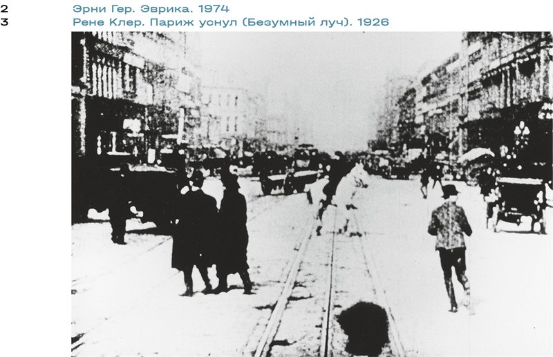 Очевидно, переживания Горького были усилены трюком киномеханика, который, судя по всему, играл с эффектом неподвижности изображения, зажигая лампу проектора и выжидая нужный момент, когда можно начать крутить ручку аппарата. Этот переход от статичного кадра к фильму, который так полюбился режиссерам-художникам, свидетельствует об одном из уникальных качеств этого вида искусства, восходящего к фотографии, – способности замораживать время. Именно выразительность этой наивной магии во многом способствовала успеху фильма Рене Kлера Париж уснул (1926) (илл. 3), состоящего из вариаций на тему искаженного времени, которое то замедляется, порой даже останавливаясь, то ускоряется. (По сюжету источником этих изменений было действие специального луча, созданного безумным ученым и направленного на город с Эйфелевой башни; на деле же Kлер просто забавлялся со скоростью съемки.) Противоположность этого приема – неожиданное движение на фоне абсолютного покоя, которое можно наблюдать в фильме Kриса Маркера Взлетная полоса (1962). Среди череды смонтированных фотографий есть едва заметный «живой» момент – крупный план моргнувшей женщины.