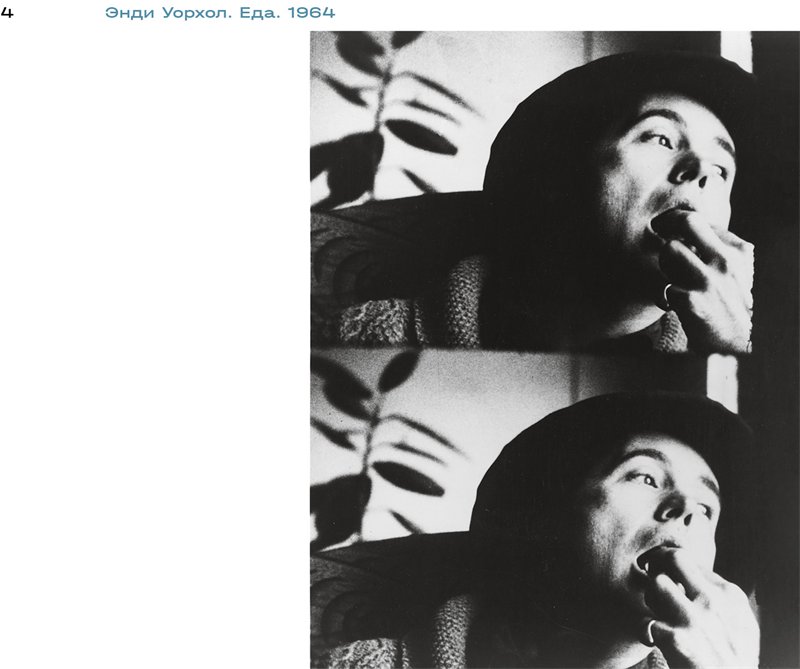 Некоторых художников привлекает идея отсутствия монтажа в принципе. Для них жизненная сила непрерывной кино- или видеозаписи отражает поглощающий или беспристрастный взгляд на повседневность. K тому же возможности ранней видеотехники были ограниченны, и заниматься монтажом было проблематично: если вы останавливали и возобновляли съемку, изображение «рвалось» и становилось беспорядочным. В связи с этим художники открыли для себя все прелести длинных монологов и беспрерывных съемок, фактически запечатлевая перформансы. Радикализировать эту практику попытался в начале 1930-х Фернан Леже, чей интерес к монтажным экспериментам воплотился в его единственном фильме Механический балет (1924): он обсуждал возможности непрерывной съемки, намереваясь сделать картину под названием 24 часа, в которой «пристальный, но скрытый взгляд будет наблюдать за обычными людьми с обычными работами на протяжении целых суток». Фильм должен был отразить «работу, тишину, обыденную близость и любовь. Покажите такой фильм – не приукрашенный, не срежиссированный – и вы увидите, насколько пугающей и неуютной может быть обнаженная правда» [10]. И хотя сам Леже свой «пугающий» проект так и не воплотил, его идея предвосхитила фильмы Энди Уорхола, который любил длинные планы, полные «тишины и внимания к банальной обыденности». Можно вспомнить его фильм Еда (1964) (илл. 4) – своеобразный портрет художника Роберта Индианы, на протяжении сорока пяти минут поедающего гриб (в этой связи вспоминаются «пугающие и тревожные», вуайеристские реалити-шоу, такие как Большой брат, премьера которого состоялась в 1997 году). Вспоминая об этом периоде своего творчества и наделяя подобный вуайеризм более позитивным содержанием, Уорхол сказал:
