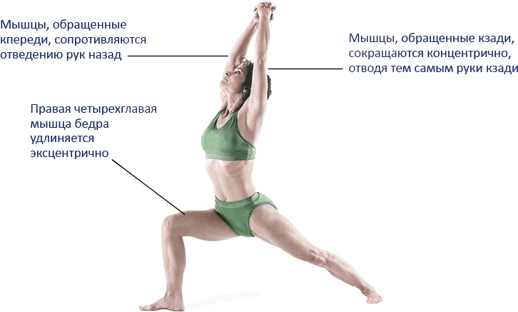 В хатха-йоге мы наблюдаем концентрическое сокращение и эксцентрическое удлинение в сотнях ситуаций. Простейшая из них: какая-то мышца или группа мышц сопротивляется силе тяжести, как, например, мышцы спины, которые концентрично сокращаются для того, чтобы поднять туловище из положения наклона в положение стоя. Когда же вы начинаете наклоняться, мышцы спины сопротивляются силе тяжести, которая тянет тело вниз, эксцентрично удлиняясь, чтобы сделать движение плавным.