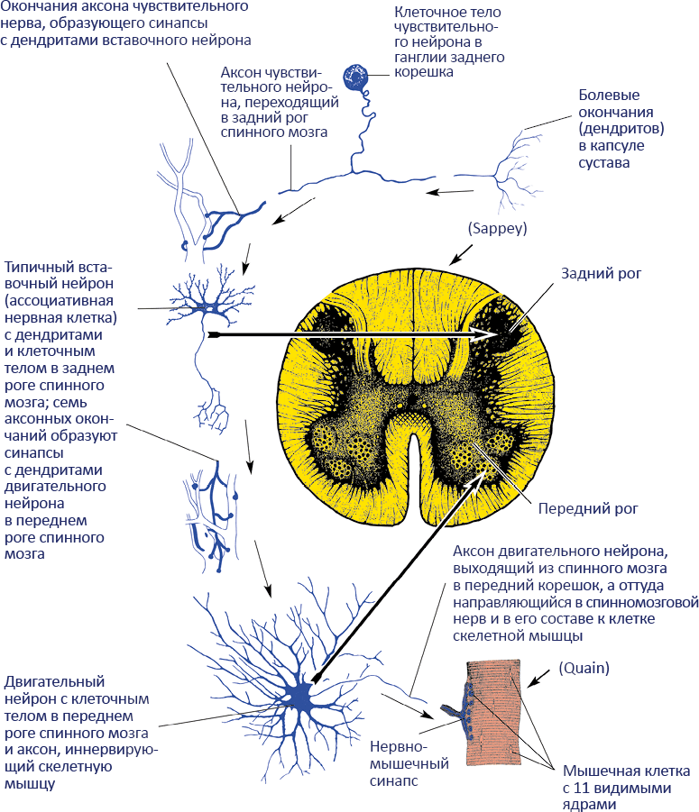 Рис. 1.4. Поперечный срез спинного мозга на уровне пятого поясничного сегмента (L5) с сенсорными входами от суставного рецептора, типичным вставочным нейроном и двигательным выходом в клетку скелетной мышцы. Маленькими стрелками указано направление хода нервных импульсов, а также отношение между пре- и постсинаптическими нейронами. Длинные толстые стрелки указывают местонахождение типичного вставочного нейрона в заднем роге спинного мозга и двигательного нейрона в переднем роге спинного мозга