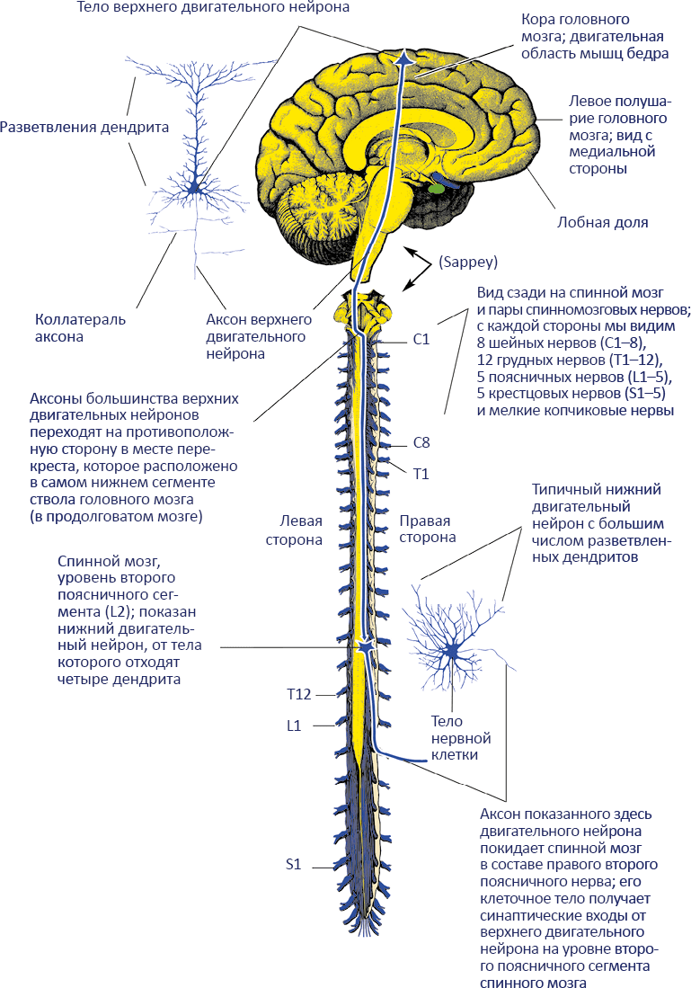 Рис. 1.5. Верхний и нижний двигательные нейроны. Клеточное тело верхнего двигательного нейрона показано в верхней части рисунка, в коре левого полушария головного мозга, а мишень этого нейрона – клеточное тело двигательного нейрона, аксон которого иннервирует правую четырехглавую мышцу бедра, – находится на правой стороне спинного мозга
