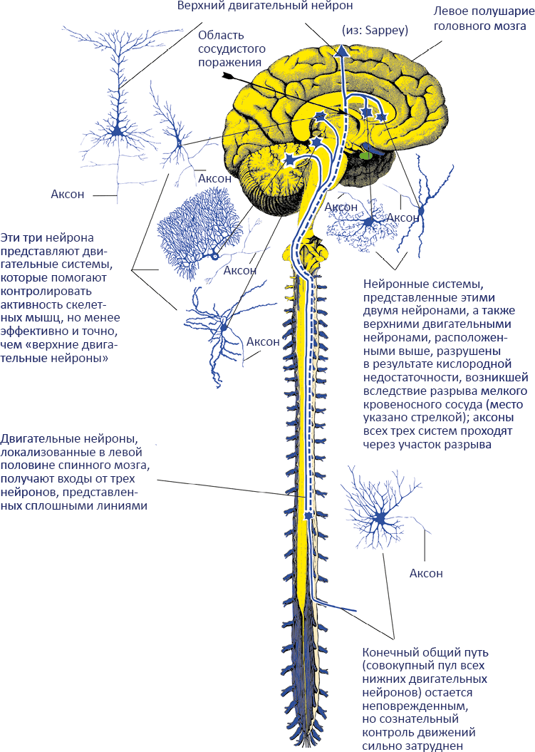Рис. 1.6. Гипотетическая схема, иллюстрирующая, как повреждение небольшого участка головного мозга может нарушить пути, важные для точного контроля активности скелетной мускулатуры, и вызывать спастический паралич. Пунктирными линиями обозначены пораженные системы, а сплошной линией – остальные системы, которые сами утратили способность влиять на точность мышечной активности
