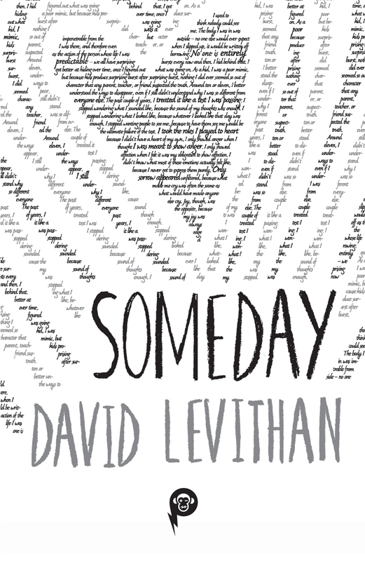 I’m also not prepared for everything she tells me, and how easily she says it. It’s almost like she’s grateful to tell me what she knows, like I’m the one doing her the favor. But I’m just as grateful. All along, we’ve been partners at the jigsaw, and it’s only now that we’re realizing how some of the pieces fit. She’s telling me the person who talked to me, the person who took that day from me and lived my life before leaving me at the side of the road, is named A. I tell her that, yeah, I met A two days in a row, when he/she was calling himself/herself Andrew and was in the bodies of two different girls, two days in a row. Rhiannon doesn’t seem surprised. But I’m damn surprised to be talking to someone who hears what I have to say and believes all of it. Rhiannon tells me A was really sorry about what happened with me—and from the way she apologizes on A’s behalf, I realize that, whoa, she is totally in love with this person who goes from body to body. The hole A’s left in her life is even bigger than the one in mine. I lost a day. She’s lost more than that.