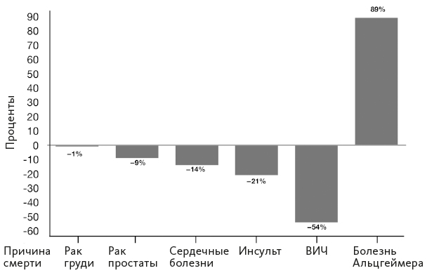 Моя миссия по борьбе с этим заболеванием не закончится, пока я жив. Здоровье мозга – моя страсть в течение последних сорока лет: и профессиональная, и личная. Мой отец умер от болезни Альцгеймера – самой распространенной формы деменции, для которой нет терапии, не говоря об излечении, несмотря на миллиарды долларов, брошенных на научные исследования. Сейчас она поражает каждого десятого американца в возрасте от шестидесяти пяти и старше. При этом никакого внимания не уделяется тому, что женщины страдают от нее вдвое чаще мужчин. У нас есть существенный прогресс в других областях – например, в лечении болезней сердечно-сосудистой системы, инсультов, ВИЧ/СПИДа и некоторых видов рака. Но взгляните на такой факт: между 2000 и 2014 годами число умерших от этих заболеваний значительно снизилось, однако за тот же период смертность, связанная с болезнью Альцгеймера, увеличилась на ошеломительные 89 %[8].
