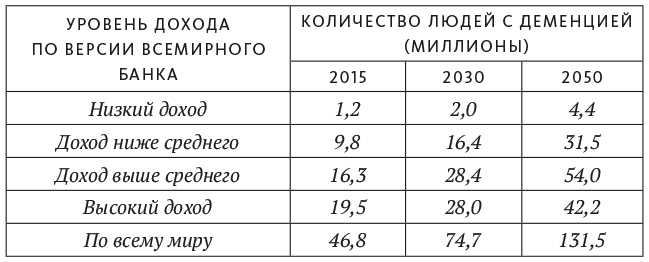 Заболеваемость растет там, где случаи деменции были исторически более редкими по сравнению с западными странами. С учетом нынешних тенденций, к 2050 году рост деменции в Западной Европе составит 26 %, в Африке – взлетит на 291 %, в Центральной Америке прогнозируется повышение на 348 %. Это говорит о том, что перед нами не генетическая проблема. Хотя существуют гены, которые увеличивают риск болезни Альцгеймера, чисто генетические случаи заслоняются случаями воздействия окружающей среды и поведения. Большинство больных деменцией живет в странах с высокими доходами или доходами выше среднего уровня, и к 2050 году невероятные 73 % из 131 миллиона больных составят люди, располагающиеся в верхней части шкалы доходов, как видно из следующей таблицы[10].