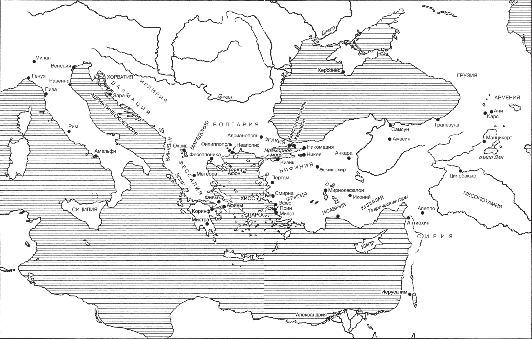 Пространство, охваченное ими, четко определить было бы затруднительно, потому что оно менялось во времени. Византией была империя Юстиниана, простиравшаяся от Испании на западе до пустынь Месопотамии на востоке, от Дуная и Черного моря на севере до Средиземноморского побережья Африки на юге. И ею же называлась территория, находившаяся под властью последнего из Палеологов, которая включала в себя лишь город Константинополь с окрестностями и несколько небольших кусочков Пелопоннеса. Но все-таки можно достаточно точно очертить круг региона, где процветала византийская культура. Это вся Малая Азия и Греция, Западные Балканы и часть Сицилии, а также юг Италии. Именно здесь происходило основное ее развитие, а потому именно эти территории должны стать предметом нашего рассмотрения, несмотря на многочисленные ее ответвления и проникновение в другие страны.