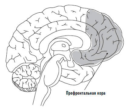 Принимая решения и размышляя над проблемами, человек задействует участок головного мозга, известный как префронтальная кора. Вообще, кора представляет собой наружный слой головного мозга, то самое изрытое извилинами серое вещество, которое мы видим на картинках. Этот слой толщиной около 2,5 мм покрывает мозг подобно одеялу. Префронтальный отдел коры, расположенный позади лобной кости, достаточно невелик. Этот отдел, появившийся у человека в процессе эволюции последним, составляет жалкие 4–5 % от полного объема мозга.
