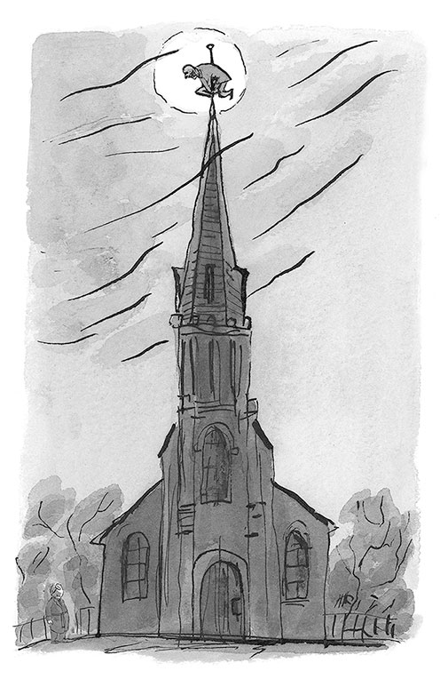 И в самом деле – едва вдали показалась церковь, как стало видно, что на шпиле у нее примостился какой-то человек. Его силуэт отчетливо вырисовывался на фоне низко висящей серебряной луны.