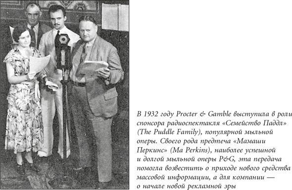 Радио потребовалось время, чтобы утвердиться в качестве средства массовой информации: основной формат радиовещания (коммерческое вещание по общенациональным сетям, финансируемое за счет рекламы корпораций) медленно, шаг за шагом обретал форму на протяжении 1920-х – начала 1930-х годов, пока радиостанции, студии и коммерческие спонсоры экспериментировали с различными способами составления программ. Procter & Gamble сыграла в этом процессе самоопределения ведущую роль, выступив с серией творческих (и дорогостоящих) инициатив. В 1933 году, с национальным дебютом «Мамаши Перкинс» (Ma Perkins), компания отыскала подлинную формулу успеха. Мыльные оперы стали неотъемлемой принадлежностью радиовещания и главной опорой маркетинговых кампаний P&G. К тому моменту как Депрессия в конце 1930-х годов начала спадать, P&G завоевала прочную позицию в качестве одного из крупнейших рекламодателей в эфире. Точно так же, как сорок лет тому назад с журналами, P&G начала осваивать новое средство массовой информации, пока оно находилось на стадии эксперимента, и нашла творческий, яркий способ ввести туда рекламу своих брендов.