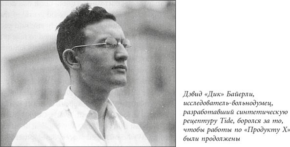 Это стало ключевым моментом для продукта, который вскоре стал известен под условным названием «Продукт Х». Байерли приходилось работать в одиночку, и продвигалось его исследование весьма неравномерно. Он не смог бы бесконечно продолжать свои старания без поддержки кого-нибудь из администрации. Что касается Хальберштадта, то он, хотя и проявлял осторожность, был заинтригован. Данные Байерли указывали на некоторые интересные результаты, полученные, когда в качестве модифицирующей добавки к поверхностно-активному веществу он использовал пирофосфат натрия, химическое соединение, которое недавно стало коммерчески доступным.
