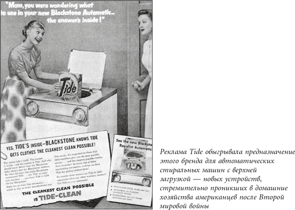 Первые маркетологи, занимавшиеся продвижением Tide, также извлекли выгоду из счастливого совпадения – одновременного начала распространения в США этого синтетического моющего средства и автоматических стиральных машин. В горячке послевоенного экономического роста и в условиях возросшего благосостояния потребителей многие домашние хозяйства приобретали современные бытовые устройства, в том числе новинку – стиральные машины барабанного типа с верхней загрузкой. Учитывая, что появление на рынке Tide произошло в то же время, P&G сумела увязать обе новинки в потребительском сознании в единое целое. Реклама Tide ухватилась за эту тему и часто включала изображения новых машин. Эксклюзивные соглашения с производителями стиральных машин, согласно которым вместе с машиной упаковывали и пачку Tide, укрепило такую взаимосвязь. Со временем Федеральная торговая комиссия США запретила подобные эксклюзивные соглашения, но к тому моменту как это произошло, Tide уже завоевал себе прочное место в умах покупателей как товар, который следует использовать в новых устройствах{128}.