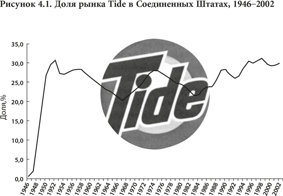 Сотрудники P&G обеспечили компании двухгодичный отрыв, на который рассчитывал Макэлрой. Colgate сумела вывести на рынок синтетическое моющее средство Fab только в апреле 1948 года. Lever запустила свой порошок Surf в июле того же года. Согласно оценке, сделанной P&G, и независимому анализу, проведенному журналом Consumer Reports{140}, ни один из продуктов не обладал рабочими характеристиками Tide. К 1950 году, когда его производство вышло на действительно высокий уровень, Tide устремился к новым рыночным достижениям (рис. 4.1).