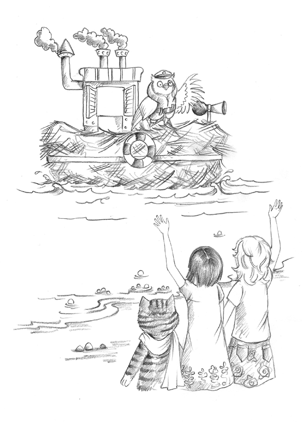 Голди, Джесс и Лили сошли на берег. Филин отчалил, и подружки крикнули ему на прощание: