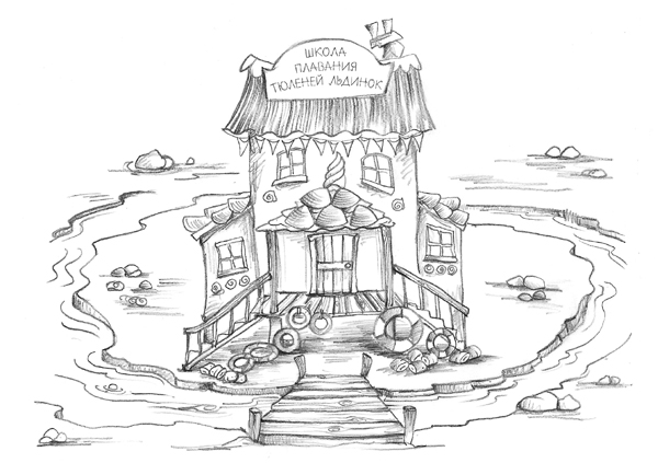 Они подошли к симпатичному домику. Его украшали разноцветные ракушки и окружал глубокий ров. К двери вёл узкий деревянный мост. Снаружи лежала целая гора надувных кругов, нарукавников и досок для плавания. Одни крошечные – для мышек и других миниатюрных созданий, другие крупные – такие подошли бы и девочкам! Табличка на доме гласила: «Школа плавания тюленей Льдинок».