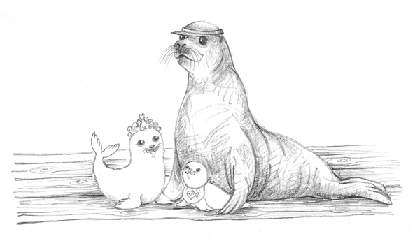 На пляже тюлени не обходили приливные заводи. Они ползли по песку, отталкиваясь от него ластами, ныряли в воду и скользили в ней. Так они перебирались из одной впадины в другую, пока не достигли бухты, украшенной зелёными и жёлтыми флажками. Там собрались гости, которые пришли на праздник. Все они весело болтали. Среди них было много знакомых Лили и Джесс, которые, заметив девочек, крикнули им: «Привет!»