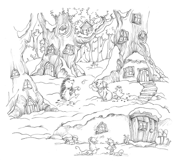 Джесс и Лили последовали за кошечкой по занесённой снегом тропе. Вскоре подружки вышли на Грибную поляну. Крыши домиков блестели под ясным солнцем, а весёлые обитатели леса резвились в снегу!