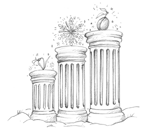 Она вывела их на соседнюю поляну. Снег сверкал под солнцем, словно россыпь драгоценных камней. В самом центре возвышались три ледовые колонны – гладкие и прозрачные, как стекло. На первой колонне покоилась фиолетовая засахаренная слива, на второй – огромная снежинка. Из третьей колонны рос сливочно-белый подснежник с серебряными блёстками на лепестках.