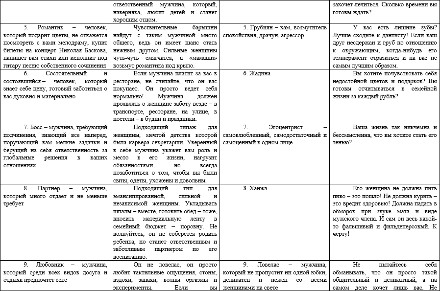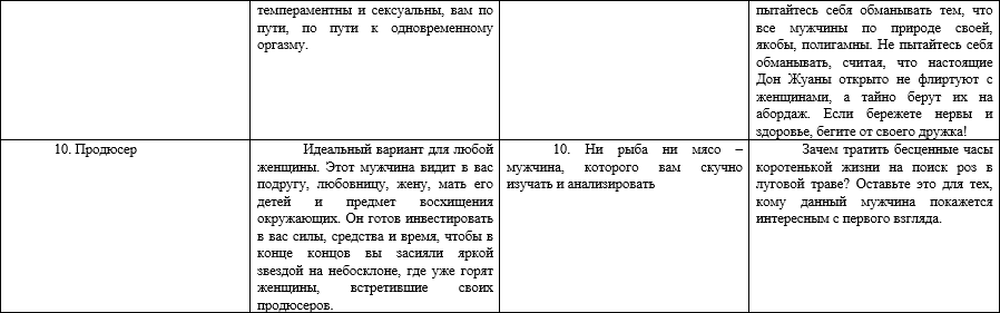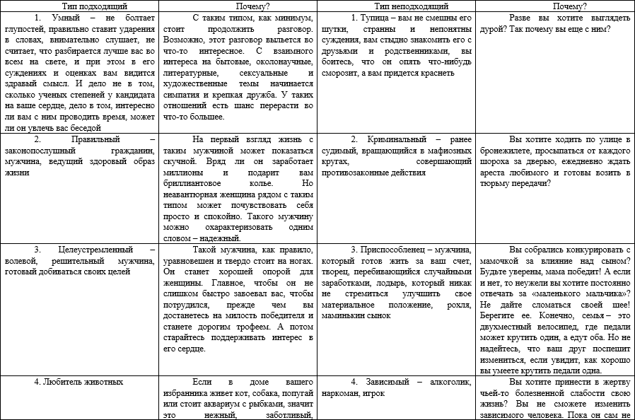 Эта несложная таблица разделит мужчин всего на два типа – подходящих для отношений и неподходящих. Приглядитесь к своему избраннику, проанализируйте его человеческие качества, хобби, увлечения, сверьте с таблицей и прекратите отношения с неподходящими типами. Не приносите себя в жертву тем, кто этого не заслуживает. Жизнь одна, и ее стоит сберечь для большой, красивой и страстной любви!