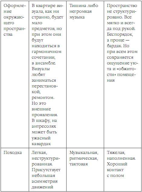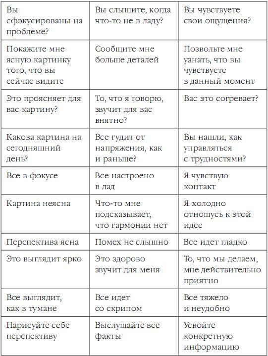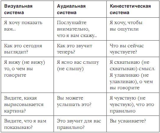 Приведенная ниже таблица не просто поможет вам определиться в репрезентативном мире своего партнера, но и потренирует все ваши собственные каналы восприятия. Итак, погрузитесь в изучение.