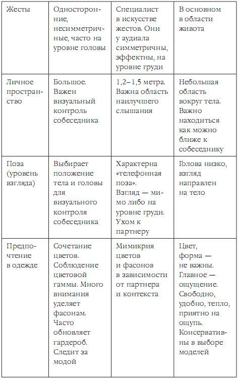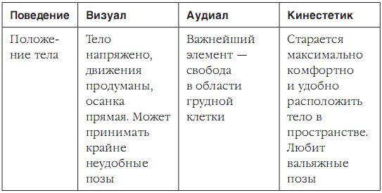 Далеко не всегда у вас получится сразу заговорить с человеком на его языке. Далеко не всегда у вас есть возможность с ним просто заговорить. А, тем не менее, перед вами может стоять задача определить, в какой репрезентативной системе он живет, кто он – визуал, аудиал или кинестетик. Для этого необходимо внимательно понаблюдать за поведением изучаемого вами объекта. О, нет, я говорю сейчас не о поступках, а о физиологических и бытовых, рефлексивных моментах поведения.