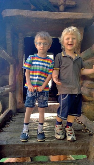 Отдельная история – это детдомовский запах. Первые дни Сережа так сильно пах детдомом, что Дима говорил «надо маску надевать». Сейчас этого уже практически нет. Если и появляется, то редко. Каждый день купаемся, массажи делаем с ароматным маслом. Глаза проверили, у него они недоразвиты, и череп недоразвит. В общем, много чего надо налаживать. Ходим в бассейн, и Сережа научился хоть как-то расслабляться – может теперь даже лежать в воде. А то был такой гипертонус, что ни одной мышцы разжать не получалось, как деревянный. Страха воды у нас теперь нет, хотя раньше стоило включить душ, и все, катастрофа. Он начинал орать, как дикий зверь. Дома в принципе всего боялся, особенно собак. Мы приехали, и в первый вечер я его вообще не снимала с рук. Он кричал, боялся даже ноги на пол опустить. Сейчас маленькой собаки он вообще уже не боится, даже гуляет с ней. А большую, если она близко к нему подойдет, просто обходит. Еще из особенностей – у нас обнаружился энурез. Врачи ничего не сказали, мы не подготовились, и Сережа по дороге домой описал весь самолет. Он до сих пор по ночам писается, но теперь мы уже поняли, что это болезнь – памперсы купили и собираемся на прием к неврологу. А в целом нормальный мальчик, никакой не «безнадежный», как нам в Доме ребенка говорили.