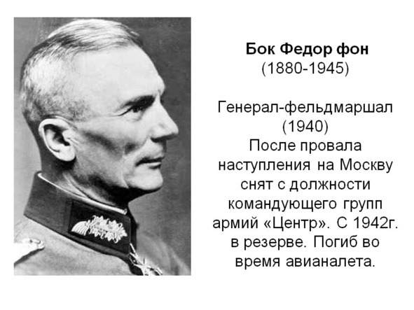 Мориц Альбрехт Франц-Фридрих Теодор фон Бок – немецкий военачальник, генерал-фельдмаршал. Командующий группы армий «Центр» во время вторжения в СССР. Командовал наступлением на Москву осенью 1941 году.
