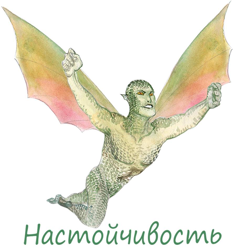 Но самое большое впечатление на ребят произвела Настойчивость – высоченное мускулистое существо, похожее на человека. Тело существа покрывала змеиная кожа с серебристо-зеленым отливом. Расправив мощные крылья и подняв руки в знак победы, существо взмывало ввысь. Ребята обратили внимание на обращенный вверх взгляд и победоносную улыбку существа.