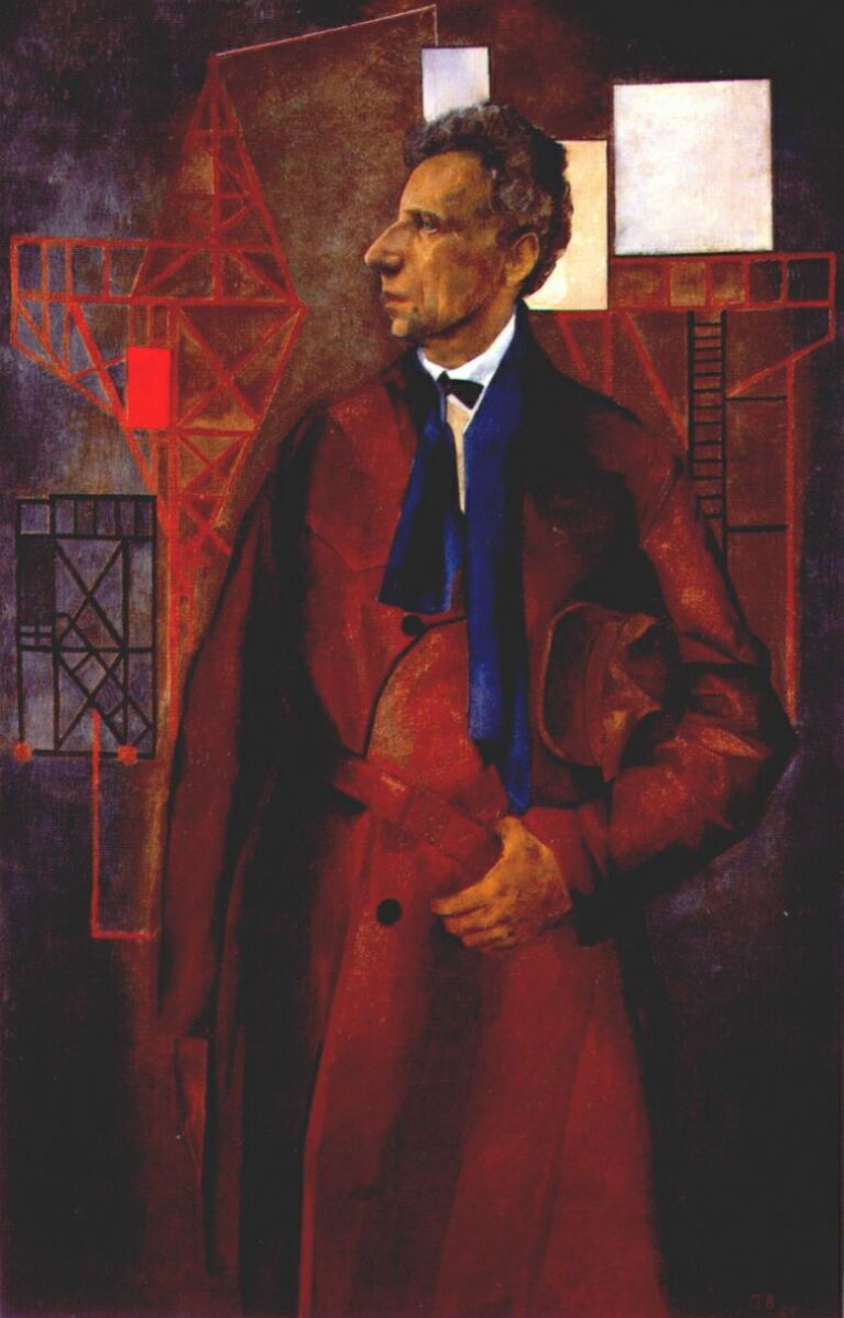 Задача соотношения фигуры в пространстве картины несет одновременно и декоративную, и смысловую конструктивную нагрузку. Основным фоном картины является изображение театральной конструкции Л. С. Поповой к пьесе «Земля дыбом», поставленной в театре Мейерхольда20. Их ярко выраженный конструктивистский, производственный характер напоминает об атмосфере большой стройки, стройки нового социалистического общества, активным участником и организатором которого является художник. Этим во многом определяется чувство современности, являющееся отличительной чертой большинства его работ. Вильямс один из первых сумел определить некоторые существенные черты портрета советского интеллигента творческой личности.