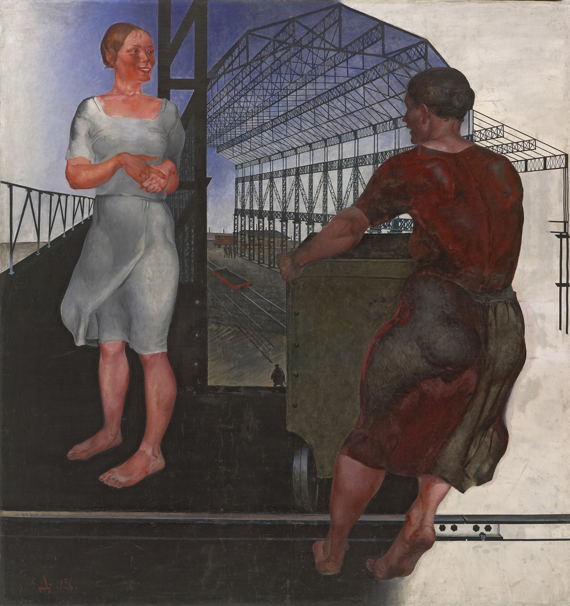 Одним из самых известных советских художников можно считать Александра Александровича Дейнеку. Зарождение его художественного пути совпало с образованием нового строя российского государства, и Дейнека, со всей страстью молодого живописца подходит к изображению своего времени. Окончив ВХУТЕМАС он был отправлен в командировку в Донецкую область, и впечатления, полученные там, послужили прекрасным базисом для его творчества. Развитие индустриальной эпохи, быт нового, советского человека, строительство гигантских промышленных заводов и шахт – всё это находит отражение в его произведениях того времени. Полотно «На стройке новых цехов» (рис.3) было создано Дейнекой в 1926-ом году22. Внимание зрителя привлечено, в первую очередь, сложным композиционным решением: на полотне художник использовал приём двух точек схода построения линейной перспективы. Такое решение словно разделяет картину на два противоположных образа. Девушка, изображенная в левой части картины, воздушная, легкая, исполненная в светлых тонах, словно противопоставлена левой части картины, на которой, изображенная в тёмном, бардовом платье, женщина с силой тянет на себя тяжелую тележку. Художник уделяет пристальное внимание передаче силы и мощи человека, образы скульптурны, и, даже, несколько напоминают образы мастеров Возрождения. Дейнека в своей картине воспевает физическую силу человека, женщина справа – это в первую очередь движение, её мышцы чрезвычайно напряжены, показано невероятное усилие, которое ей требуется для того, чтобы тянуть тяжелую тележку. Художник использует интересный приём: он оставляет правый нижний угол картины не закрашенным, тем самым, создавая визуальный эффект реалистичности происходящего, словно женщина вот-вот выкатит тележку на зрителя.