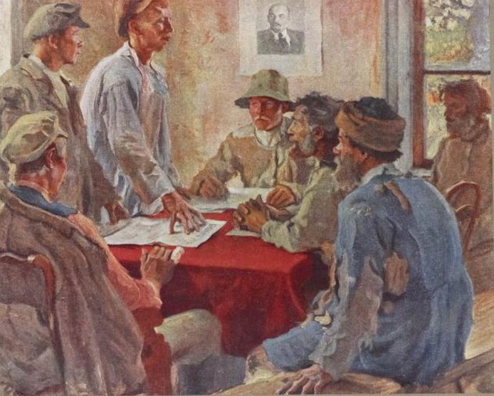 Надолго запоминается изображенное на картине заседание комитета бедноты, в котором председатель, руководствуясь установками Большевистской партии, вдохновенно убеждает крестьян в открывшихся для них перспективах. Собравшиеся члены комитета бедноты слушаю его речь внимательно, выражения их лиц крайне настороженны по отношению к председателю. Художник ярко и убедительно, психологически характеризует всех членов комитета – этих новых хозяев земли. Одни из них, более «передовые» люди деревни, полны убежденности в правоте и значительности совершаемого ими дела. Другие, слушающие с меньшим интересом, чувствуют себя скорее растерянно, словно не совсем уверенно в этом новом, непривычном для них положении. Каждая деталь картины появилась на ней не случайно. Например, красиво стоявшее прежде где-нибудь в дворянской усадьбе кресло, в котором сидит один из членов комитета, словно немой свидетель страшных переворотов и бесчинств, происходящих во время ликвидаций помещичьих землевладений. Газета «Беднота», лежащая на суконной скатерти перед председателем, указывает на повышенное, пристальное внимание, которое новая власть уделяет деятельности комитетов для борьбы с контрреволюционной кулачеством. Даже такая, на первый взгляд, непримечательная деталь, как перевязанный палец руки одного из заседающих, оправданна, она показывает зрителю, что перед ним обыкновенный крестьянин, который прямо с поля пришел сюда, будучи прельщенным тем, что отныне он может решать важные общественные дела, до которых ранее не допускался.