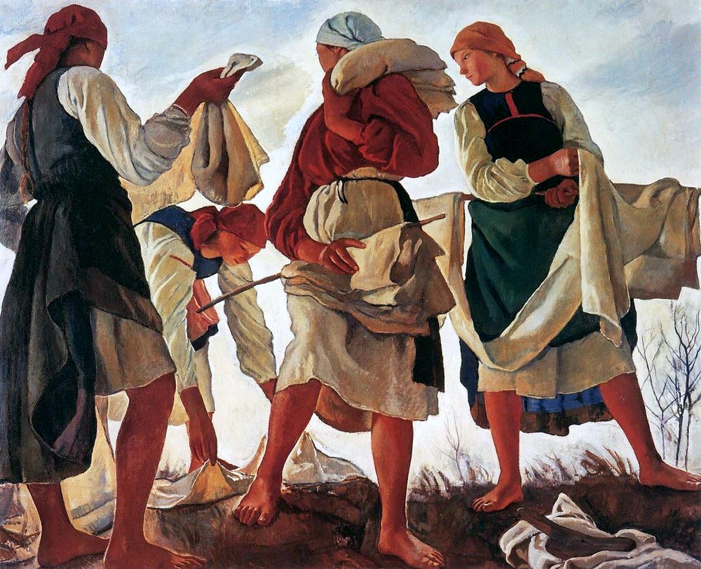 Все фигуры отмечены определённым цветовым акцентом: красный, изумрудно-зелёный, серо-синий – цвета одежды девушек словно сливаются в единый живописный колорит. Между тем, красочно отражен и контраст золотисто-коричневых ног крестьянок и белоснежных холстов. Всё это придает картине внутреннюю динамику, позы девушек показаны в энергичном движении и создают ощущение устремления к центру полотна. Скульптурность их фигур, динамичность, гибкость контуров – всё это притягивает внимание и создает ощущение нечто большего, чем небольшая картина, иллюзорно полотно выглядит монументальным, скорее, предназначенным для какой-то большой плоскости. В этой картине ярко проявляется новаторство в творчестве Серебряковой, перешедшей от камерных лирических композиций к торжественным монументальным полотнам. Композиционные решения упрощаются, уступая место сложным колористическим решениям и глубине трактовки сюжета. Многие художники конца XIX-го – начала XX-го века обращались к бытовой живописи. Еще в начале XIX-го века художник А. Венецианов обращался к этой теме, создавая возвышенно-созерцательные мотивы на крестьянскую тему. Затем, ряды почитателей этой темы пополнили передвижники, обратившиеся к социально-крестьянскому вопросу и острой критике. Но в начале XX-го века происходят значительные изменения, и на смену лирической или социальной призмы бытописательства приходит принципиально новая концепция29. Отныне быт, всё существо человека, вся его жизнь заменяется бытием в самом глубоком смысле этого слова. В этом и скрыта загадка истолкования сюжетного смысла картины «Беление холста». Как неизменен цикл природы, цикл человеческой жизни, так не меняется и труд крестьян. Самое обыкновенное занятие представляется зрителю как некое, насыщенное ритуально-мистическим характером действо, отражающее величие и красоту бытия героев полотна. Горизонтальная протяженность ритма, глубокая торжественность женщин, композиция, построенная за счет низкой линии горизонта – всё это определяет монументальную тишину мгновения. Время в картине как будто замедлилось, если не вовсе остановилось, словно момент этот будет длиться вечно, так же вечно и непреходяще, как и весь этот крестьянский быт, с его непомерно тяжелым трудом, как и всё это непростое бытие «простого» человека. Многие художники того времени обращались к крестьянской теме, но подобное торжественное величие, свойственное Зинаиде Серебряковой, можно сравнить лишь с работами Петрова-Водкина. И хотя его образы скорее философски-интеллектуальные, их схожесть с работами Серебряковой проявляется в общей законченности образов. И тот и другой художник превращает своей полотно не в простое бытовое описание или рассказ, их картины – это всегда монументально-эпическое и глубокое повествование.