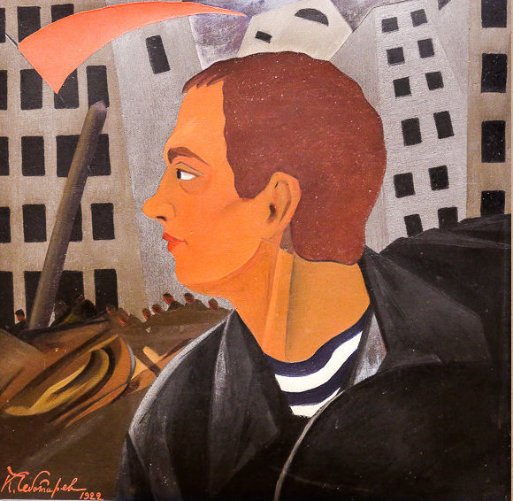 Например, портрет участника современной революции – «Рабочего» (рис.7), решительного и полного стремления к мятежам. Его воля направлена к единственной цели, в его образе мы видим суровое, решительное лицо Октября.31 И это действительно пролетарский рабочий, с его смешным курносым носом, его кожаной курткой и матросской рубашкой под ней. Не партийный коммунист, а истинный деятельность страны, где каждый в то время часть огромного механизма. Сопоставление серого урбанистического пейзажа и коричневого лица словно добавляет портрету какой-то косности, заскорузлости. Благодаря этому, картине не нужны никакие этнографические или исторические подробности, впечатление получается и так донельзя сильное, яркое, цельное. Обработанная до некоего глянца фактура неба словно противопоставлена фактуре лица и говорит зрителю о иной шероховатости – шероховатости непростого времени и революционной жизни. И вся композиция, выстроенная на какой-то грузности, приземистости, словно отражает каменно-твердый образ героя.