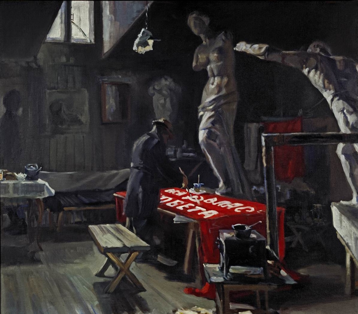 Революция октября 1917-го года создала не только принципиально новый государственный порядок, но и утвердила невиданные ранее возможности развития культурной жизни простого народа. Искусство впервые стало доступно широкому кругу зрителей самых разных слоёв общества. Вместе с тем, революция привнесла и новую идеологию в творчество художников того времени. Она потребовала переосмысления многих жанров, в том числе, и социально-бытового. Примером этого может послужить картина Николая Борисовича Терпсихорова «Первый лозунг» (рис.9) .33 На полотне изображено раннее утро, в высокие мансардные окна едва пробиваются первые лучи нового дня. Они освещают фигуру человека, склонившегося над столом, покрытым большим красным полотном. В его руках кисть, он, словно оценивая проделанную работу, застыл в некотором раздумье с кистью в руке. Белой краской на кричаще-красном фоне он выводит: «Вся власть Советам».