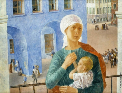C 1918-го года Петроград перестает быть столицей России и находится буквально на грани выживания. Количество жителей города сокращается более чем в два раза, но посреди хаоса, бесконечных расстрелов и озлобленных людей продолжает работать Кузьма Петров-Водкин. Он мужественно переносит невзгоды нового строя и, даже, утверждает, что голод помогает ему творить. Как и многие другие интеллигенты того времени он не перестает видеть прекрасное, ведь, иначе, жизнь для него теряет всякий смысл. И тяга к прекрасному не угасала в обессиленном беспорядками и разрухой Петрограде, в его опустевших дворцах и усадьбах. Одна из самых проникновенно нежных и, в то же время, классически строгих картина Петрова-Водкина «1918 год в Петрограде» (рис. 19) почти сразу, с первой же выставки, получила второе название «Петроградская Мадонна».