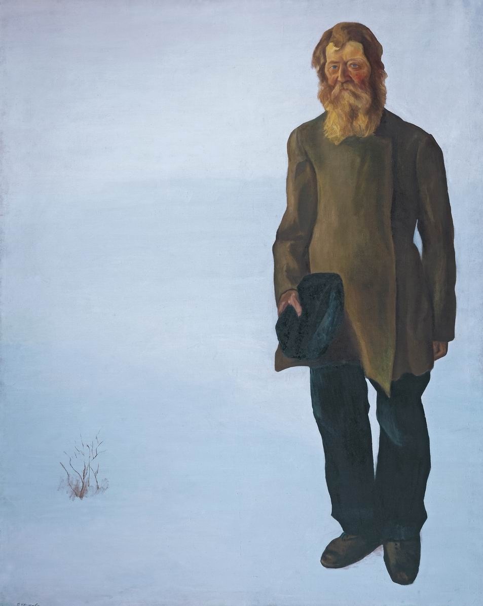 В картине отсутствует какой-либо трагический сюжет, но весь образ старика, со снятым с головы картузом и смотрящим в пустоту взглядом, поневоле видится как жест усталой покорности происходящему. В изображении фона Штеренберг полностью отказывается от имитации свойственной его произведениям картинной плоскости и прибегает к абсолютной лаконичности пространства. Портрет старика в полный рост изображен на сплошном белоснежном фоне, и, это можно было бы рассматривать как плоскость, если бы не одна небольшая деталь в углу картины. Маленький, сиротливо растущий кустик в левом нижнем углу полотна словно добавляет объёма и даёт ощущение пространства. Зрителю становится ясным и заснеженная поверхность земли, на которой стоит крестьянин, и по-зимнему бесцветное небо вокруг него.
