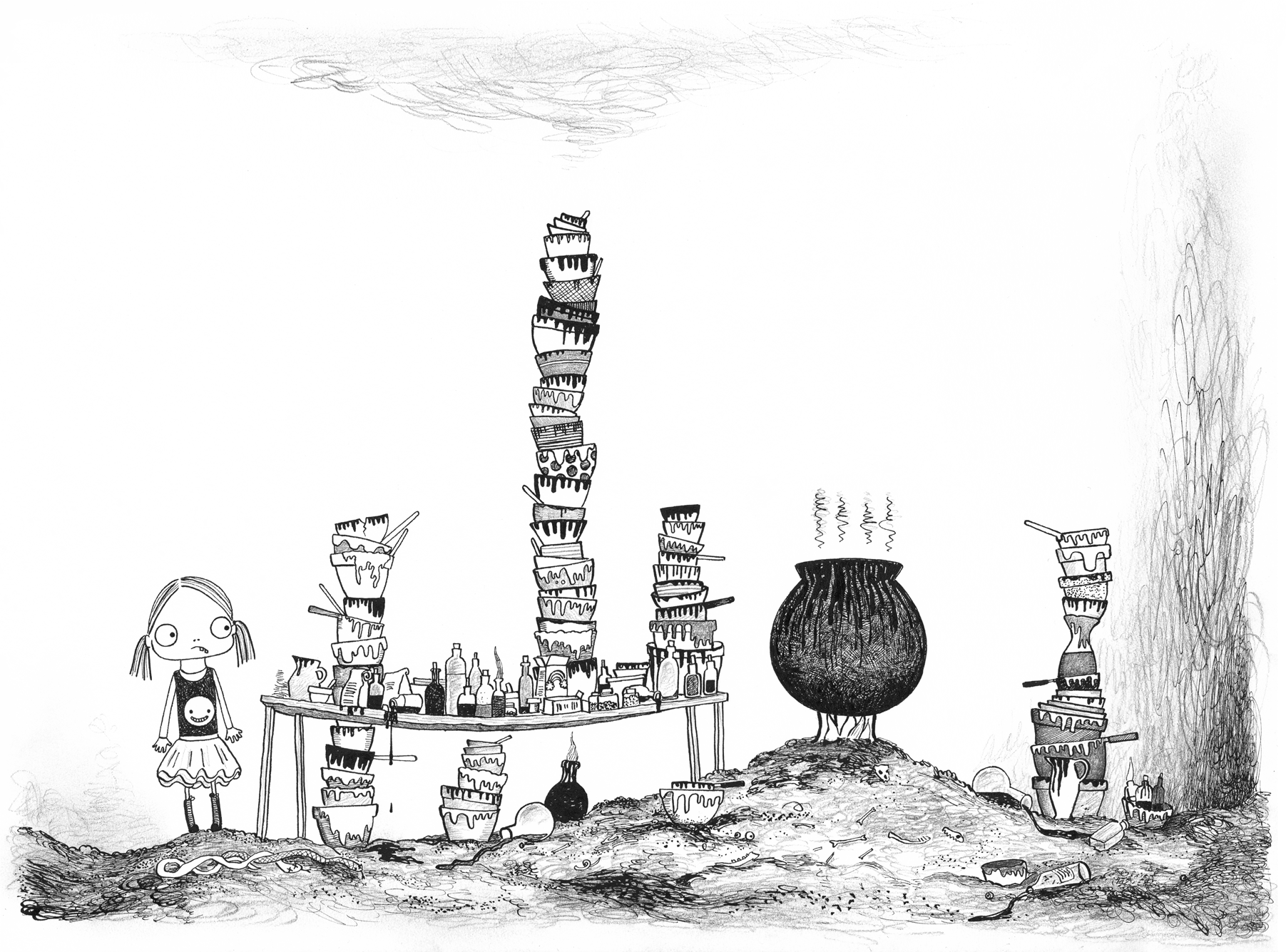 Earwig looked round and tried not to sniff too loudly. She had never seen a place so dirty. Since she was used to the airy rooms and clean polished floors of St Morwald’s, it was quite a shock. Everything was covered with dust. There was a kind of sludge on the floor made of old dirt, green mould and the remains of spells – which mostly seemed to be little white bones and small, black, rotting things. The sludge rose to a hill in one corner, on which perched a rusty black cauldron with green flames flickering under it. The smell of burning was awful. More smelly things, like dusty bottles and old brown packets, some of them spilling, lay about on the long dirty table, or were chucked higgledy-piggledy on the shelves. All the bowls and jugs stacked on the floor were covered with grime or brown slime.
