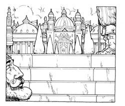 Sophie was feeling decidedly queer again when they reached the Palace. Its many golden domes dazzled her. The way to the front entrance was up a huge flight of steps, with a soldier in scarlet standing guard every six steps. The poor boys must have been near fainting in the heat, Sophie thought as she puffed her way dizzily up past them.