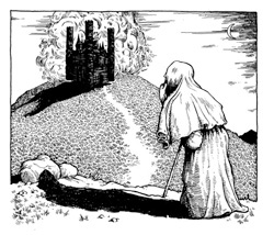 Sophie stared after him indignantly. “He thought I was a witch!” she said to her stick. She had half a mind to scare the shepherd by shouting nasty things after him, but that seemed a little unkind. She plugged on uphill, mumbling. Shortly, the hedges gave way to bare banks and the land beyond became heathery upland, with a lot of steepness beyond that covered with yellow, rattling grass. Sophie kept grimly on. By now her knobby old feet ached, and her back, and her knees. She became too tired to mumble and simply plugged on, panting, until the sun was quite low. And all at once it became quite clear to Sophie that she could not walk a step further.