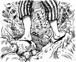 But he did dream, because Uncle Ralph had asked him to, and got out of bed as usual and walked round the fireplace to the valley, where his clothes were lying on the rocky path as usual. By now this lot of clothes were torn, covered with mud and assorted filth from a hundred Almost Anywheres, and at least two sizes too small. Christopher put them on quickly, without bothering to do up buttons that would not meet. He never wore shoes because they got in the way as he climbed the rocks. He pattered round the crag in his bare feet into The Place Between.