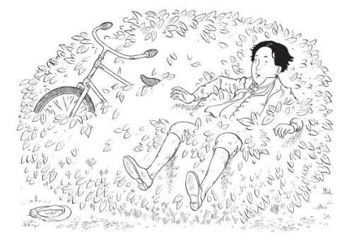 It took him three tries, but he got both feet on the pedals and pushed off, down the drive in a curvacious swoop. The swoop ended in one of the big laurel bushes. Here Roger kept going and the bicycle mysteriously did not. Cat winced again. He was quite surprised when Roger emerged from the bush like a walrus out of deep water, picked up the bike and grimly got on it again. This time his swoop ended on the other side of the drive in a prickly bush.