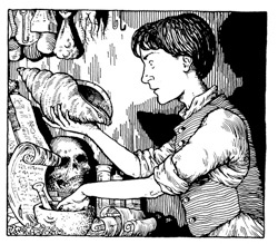 “I hate it,” said Michael, staring abstractedly at his bowl of pounded stuff. “I don’t know – there should be seven ingredients, unless it’s seven processes, but let’s try it in a pentacle anyway.” He put the bowl on the floor and chalked a sort of five-pointed star round it.