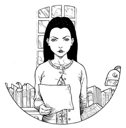 They all stared at her. For a fierce schoolteacher, Miss Angorian was astonishingly young and slender and good-looking. She had sheets of blue-black hair hanging round her olive-brown heart-shaped face, and enormous dark eyes. The only thing which suggested fierceness about her was the direct and clever way those enormous eyes looked and seemed to sum them up.