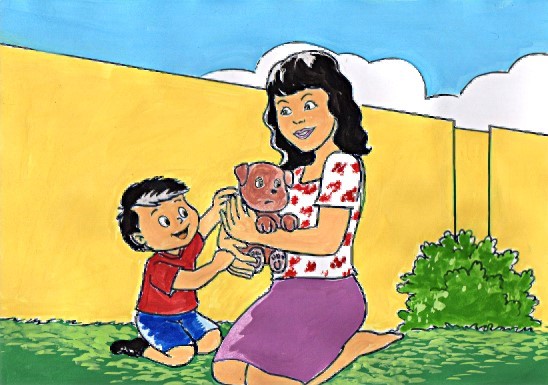 Витя был встревожен. Он слез с дивана и побежал на улицу выяснить, откуда раздавался звук. Мама пошла следом за ним. На заднем дворе, возле ворот, их ждал большой сюрприз. Это была маленькая собачка.