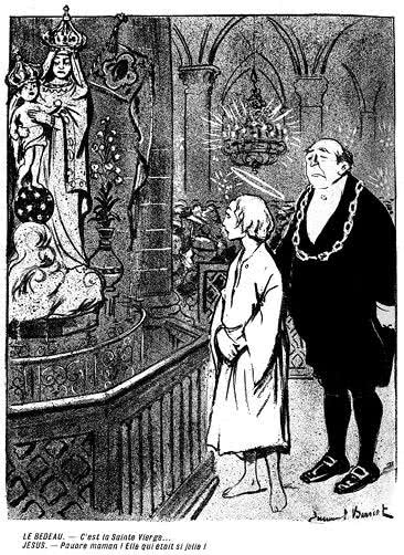 Даже в антиклерикальной карикатуре XIX–XX вв. фигура Христа могла использоваться и для атаки против христианства или религии в целом, и для того, чтобы показать, что конкретные Церкви давно о Христе позабыли. На одном из рисунков, вышедших в 1907 г. в предрождественском номере французского сатирического журнала «Assiette au beurre», юный Иисус, стоя в церкви, обескураженно смотрит на разукрашеную статую Девы Марии и печально замечает: «Бедная мама, она ведь была такая красивая» (3). Это выпад против безвкусицы массового церковного искусства, благочестивого китча XIX в.: роскошно-раззолоченных статуй и умильных картинок со святыми. На следующей странице юный Иисус, войдя в церковь, спрашивает, на каком языке там поют. Служитель объясняет, что это латынь. Иисус отвечает, что говорил только по-древнееврейски. Тут же в толпе поднимается крик: «Он знает только древнееврейский… Вон отсюда, грязный жид». Этот рисунок, высмеивавший распространенный в церковной среде антисемитизм, был более чем актуален во Франции той поры. Там как раз завершилось растянувшееся на 10 лет дело Дрейфуса – спор о том, виновен или невиновен капитан еврейского происхождения, обвиненный в шпионаже в пользу Германии, буквально расколол французское общество (см. 104a).