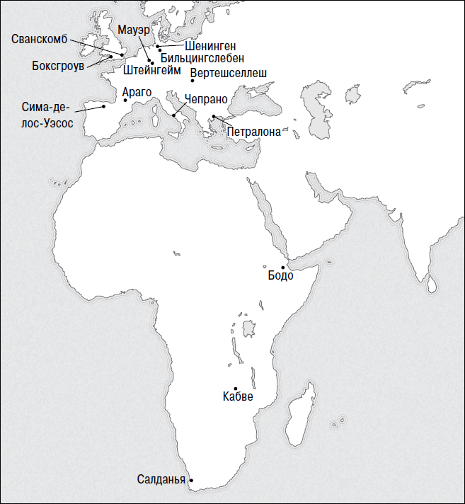 Расположение упомянутых в этой главе основных стоянок Homo heidelbergensis в Европе и Homo rhodesiensis или Homo bodoensis в Африке.