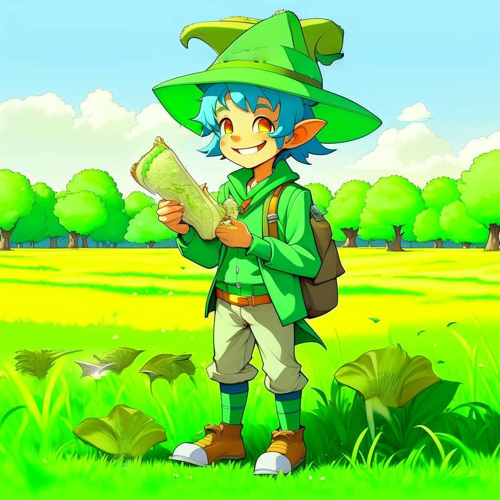 Долго им искать не пришлось. Едва они отлетели от своей ветки, как заметили внизу под собой бредущего в траве человечка в зеленом костюмчике и зеленом же колпаке. За спиной у него был рюкзак, а в руке пирожок, который он жевал прямо на ходу.