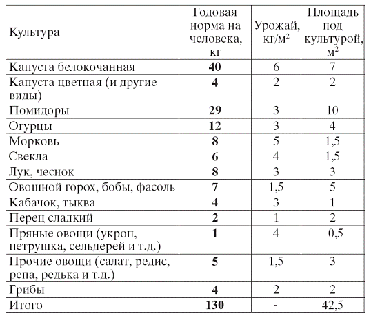Размер площади зависит от состава семьи. Если планируется полностью обеспечить себя этими продуктами питания, то на одного человека необходимо не менее 42,5 м2.