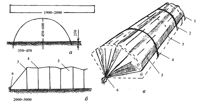 а – заготовка и дуги из проволоки; б – укрытие в разрезе; в – укрытие в рабочем положении; 1,3 – опорные дуги, 2, 4 – ветрогасящие дуги, 5 – пленка, 6 – кол (размеры в мм)