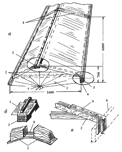 а – общий вид; б – соединение стропильца с коньками; в – соединение стропилец с бортовой доской; 1 – пленка; 2 – стропильца; 3 – конек; 4 – соединительная планка; 5 – бобина; б – бортовая доска; 7 – кол; 8 – металлическая соединительная накладка у верха стропилец; 9 – металлическая вилка (размеры в мм)